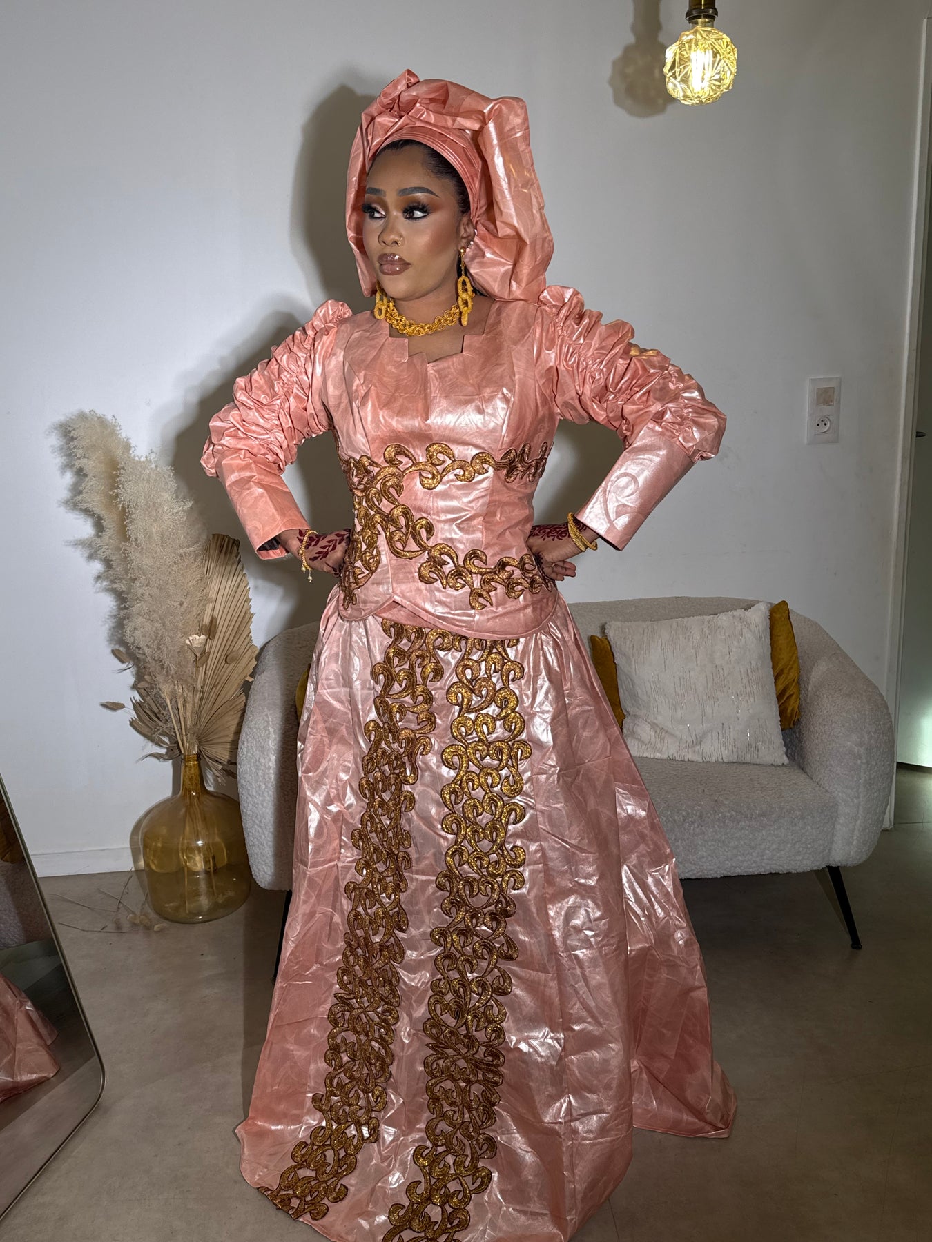 Les manches bouffantes structurées et le tissu bazin de qualité supérieure confèrent à cette tenue une allure imposante et gracieuse, idéale pour les grandes occasions.