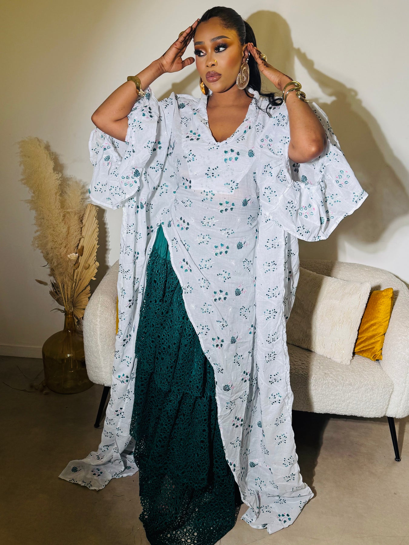 C’est Tissu coton et dentelle. Très classe simple taille unique longueur jusqu’à 1m90 haut & jupe